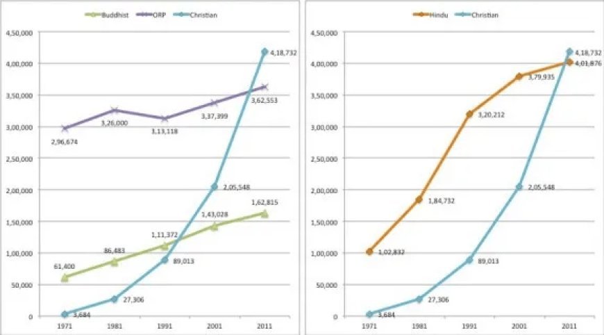 1971 की जनगणना के मुताबिक, अरुणाचल प्रदेश में ईसाई आबादी 0.79% थी, जो 2011 की जनगणना में 30.26% हो गई। 1971 में अन्य धर्मों और मतों (ORP) का हिस्सा 63.46% था, जबकि 2011 की जनगणना में यह 26.20% रह गया।