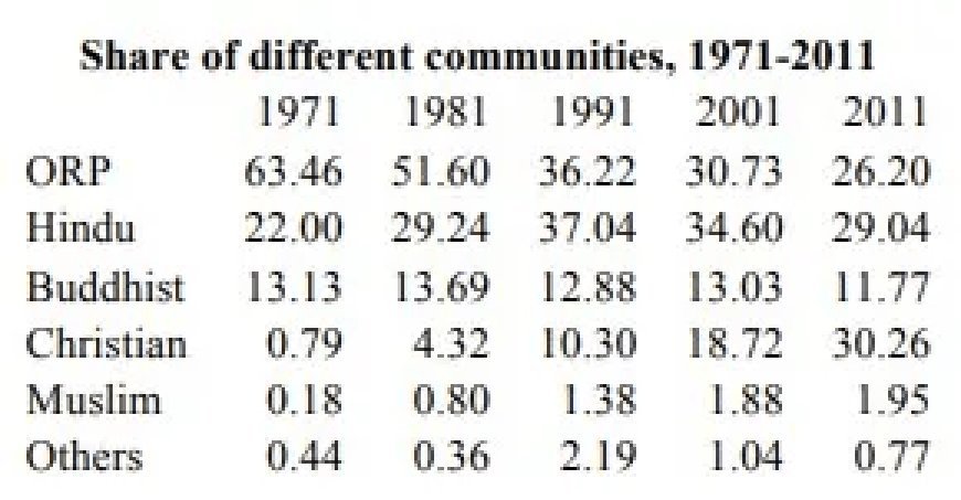 1971 में हिंदुओं की आबादी 22% थी और 2011 में यह 29.04% हो गई। 1971 की जनगणना में बौद्धों की आबादी लगभग 13% थी, लेकिन 2011 में यह घटकर 11.77% रह गई। वहीं, मुसलमानों की आबादी 1971 में 0.18% थी, जो बढ़कर 2011 की जनगणना में 1.95% हो गई।